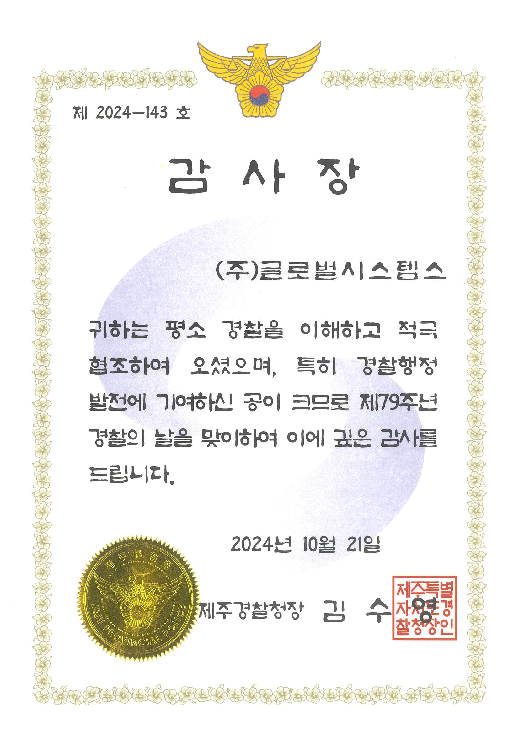 제주경찰청장 감사장